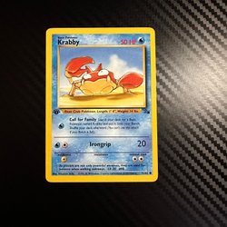 Säljer ett Pokémonkort föreställande Krabby med 50 HP. Kortet har attacken "Irongrip" som ger 20 skada.