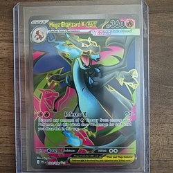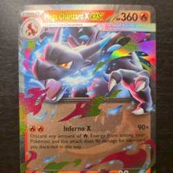 Säljer ett Pokémonkort av Mega Charizard X EX. Ett kraftfullt kort för din samling eller lek.