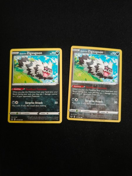 Två Galarian Zigzagoon Pokémonkort. Båda har förmågan Headbutt Tantrum och attacken Surprise Attack. Kortnummer 117/202.