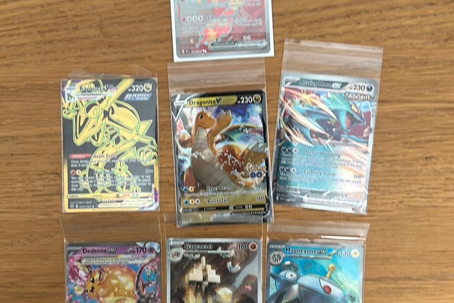 Sju Pokemonkort med olika karaktärer som Rayquaza VMAX, Dragonite V, Dedenne GX, Galarian Moltres V, Regidrago VSTAR, Garganacl och Magnezone ex.