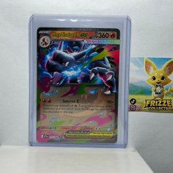 Säljer ett Pokemonkort föreställande Mega Charizard X EX. Kortet är i en skyddande plastficka.