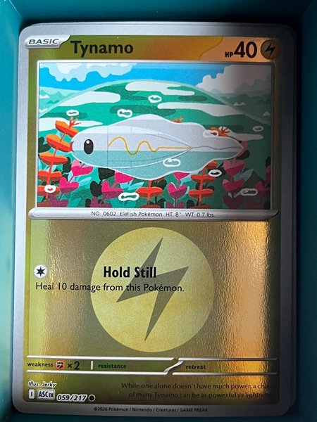 Dette er et Tynamo Basic Pokémon kort med 40 HP. Kortet har angrebet ”Hold Still”, som helbreder 10 skade fra denne Pokémon. Kortet er illustreret af Jerky og har nummer 059/217.