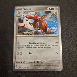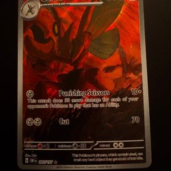 Ett Pokémonkort av Scizor från Obsidian Flames från min samling.
