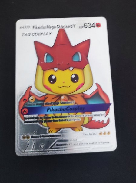 Pikachu Mega Charizard Y samlarkort. Kortet har 634 HP och är märkt som "TAG COSPLAY" och "PikachuCosplay". Det är ett specialkort och ska inte användas i TCG-spel.