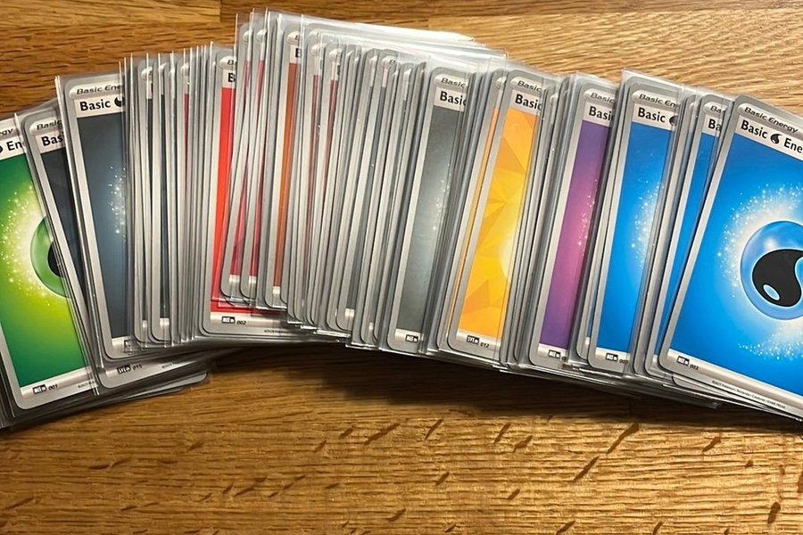 Detta är en samling av Pokémon Basic Energy-kort. Korten är av olika energityper, inklusive grön, röd, grå, gul, lila och blå.
