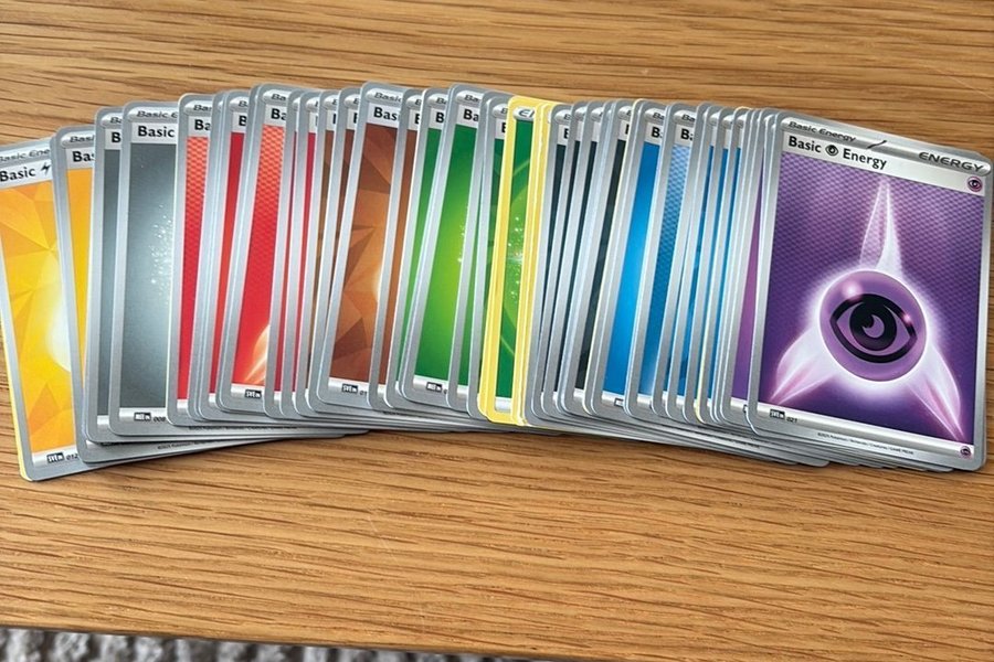 Ett urval av Pokémon Basic Energy-kort i olika färger och energityper.