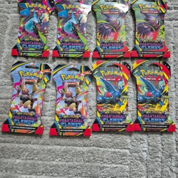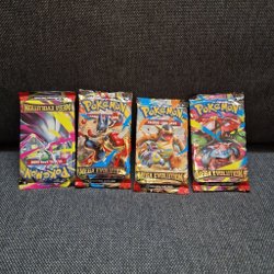 Fyra förseglade booster packs från Pokémon TCG serien Phantasm Flames. Varje paket innehåller 10 slumpmässiga spelkort.