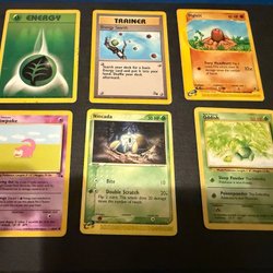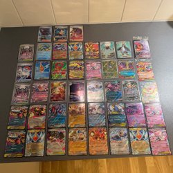 Stor samling av Pokémonkort. Inkluderar bulk-kort, holo-kort, vintage-kort och energikort. Dessutom ingår ett antal EX-kort och V-kort. Tillbehör som tärningar, kortfodral och sleeves ingår också.