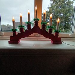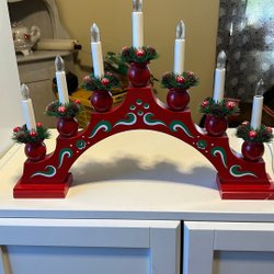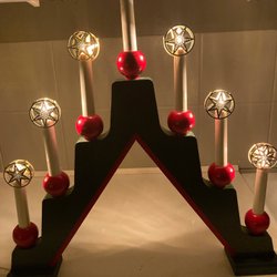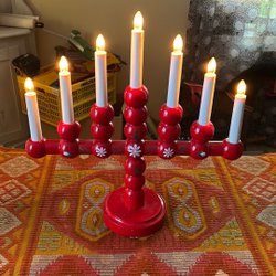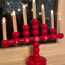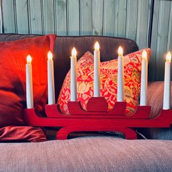 Klassisk adventsljusstake i rött trä. Perfekt för att skapa julstämning i hemmet.