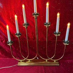En klassisk adventsljusstake i mässing ca 55 cm hög. Ljusstaken har sju ljus och en vit sladd med strömbrytare och lång sladd. Perfekt för att skapa julstämning i hemmet. Några små fläckar på mässingen. Se bilder för skick, säljes utan lampor.