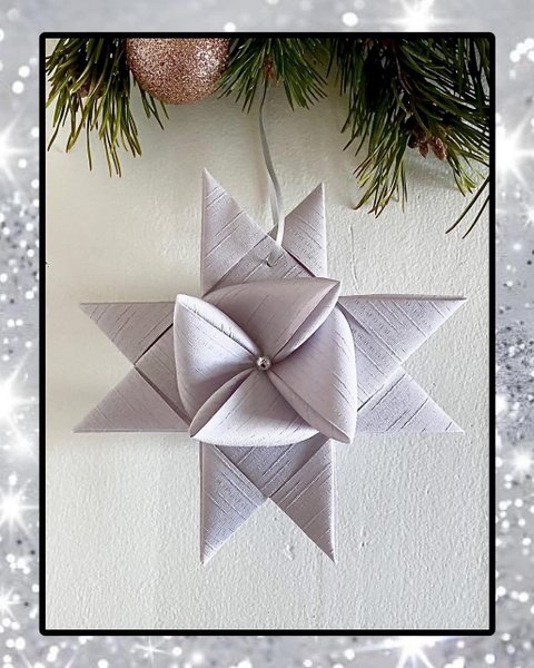 ??Smukke lysegrå lamel stjerner med struktur samt matchende satinbånd i til ophæng...og perle i valgfri farve i midten af stjernen hvis det ønskes??