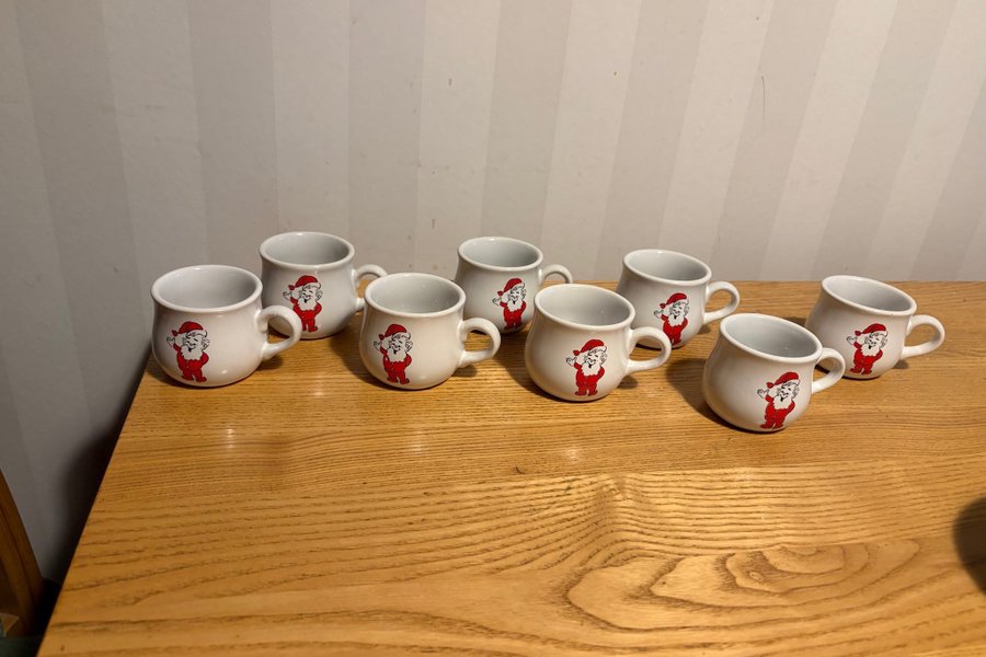 8 stycken vita muggar med jultomtemotiv. Muggarna har ett handtag, en rundad form och rymmer ca. 50 ml.