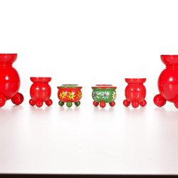 En samling röda träljusstakar med handmålade blommönster. Perfekt för att skapa en mysig och traditionell atmosfär i hemmet.