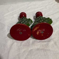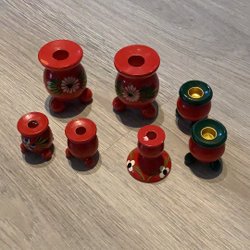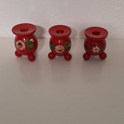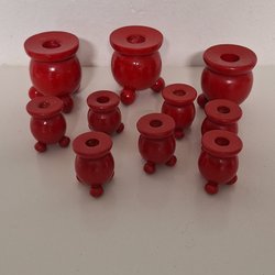Röda träljusstakar. En trearmad och två kulljusstakar