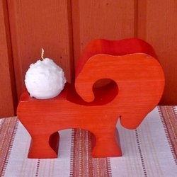 En dekorativ ljusstake i trä, formad som en bock. Den har en metallinsats för ljuset.