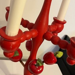 En charmig äldre röd träljusstake med plats för tre ljus. Den har en dekorativ design vilket ger den en unik och traditionell känsla. Perfekt för att skapa en mysig atmosfär .