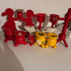 Sju små röda ljusstakar i trä, varav tre är dekorerade med blommor. Perfekt för att skapa en mysig julstämning . Höjd 5cm. Det medföljer 7st metallmanschetter.