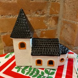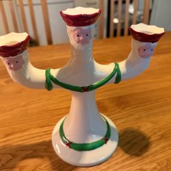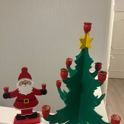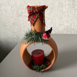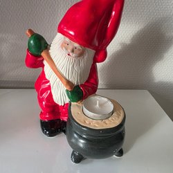 En dekorativ jultomte i keramik med en svart katt och en ljushållare formad som en säck. Tomten har en röd hatt, blå jacka och ett vitt skägg. Höjden är cirka 25 cm.