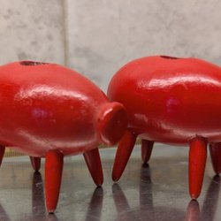 Två söta ljusstakar i trä formade som grisar. Röda med gula detaljer. Perfekt för att skapa en mysig stämning.