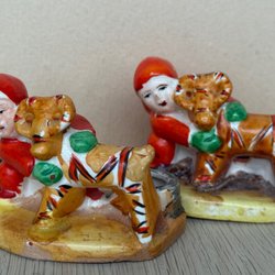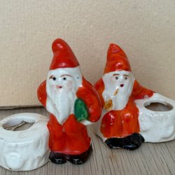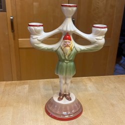 En äldre tomte som håller en skål. Den kan användas som en ljusstake. Botten har en stämpel.