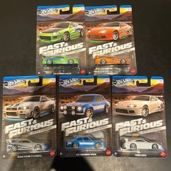Komplett samling av Hot Wheels Fast & Furious Silver Series. Inkluderar Honda Civic EG, 1996 Acura Integra GSR, Datsun 240Z Custom, 1966 Chevy Nova och Bugatti Veyron. Perfekt för samlare och Fast & Furious-fans!