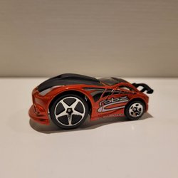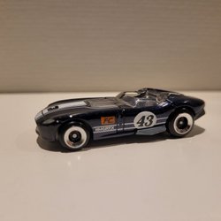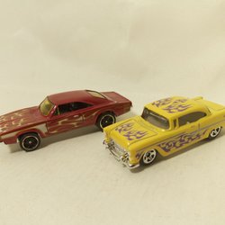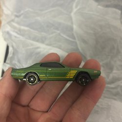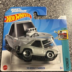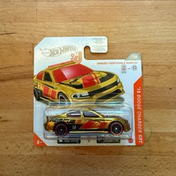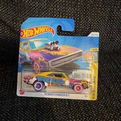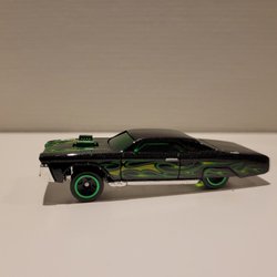 Leksaksbil av en Dodge Charger. Den är lila med en vit rand baktill och har en Hemi logga på sidan.