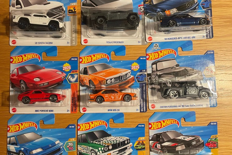 Samling av Hot Wheels bilar i originalförpackning. Inkluderar: - '20 Toyota Tacoma - Tesla Cybertruck - '89 Mercedes-Benz 560 SEC AMG - 1983 Porsche 928S - BMW 635 CSi - Custom/Personnalisé '56 Ford Truck/Camion - Honda Civic VTEC - BMW M3 Wagon/Kombi - Audi Sport Quattro