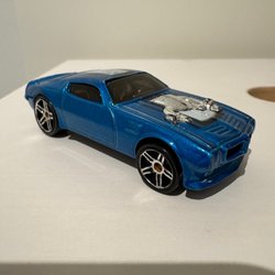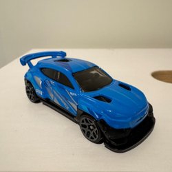 En blå Hot Wheels Corvette leksaksbil. Tillverkad i Malaysia. ©2018 Mattel.