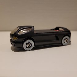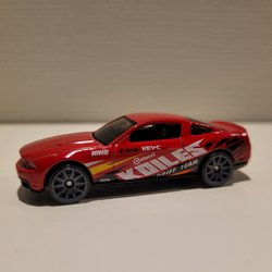Hot Wheels leksaksbil i röd färg med flammönster på sidorna. Bilen har en strömlinjeformad design och är tillverkad av metall och plast.