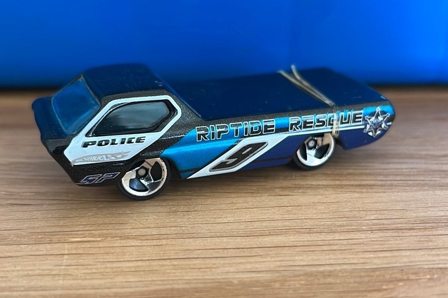 Hot Wheels Riptide Rescue polisbil i blått och vitt. Bilen har texten "POLICE" och "RIPTIDE RESCUE" på sidorna.