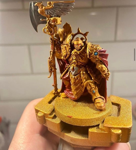En detaljerad miniatyr av en Shield-Captain från Adeptus Custodes, målad i guld och rött med blåa ädelstenar. Figuren håller en stor yxa med en örnliknande prydnad och står på en guldfärgad bas.