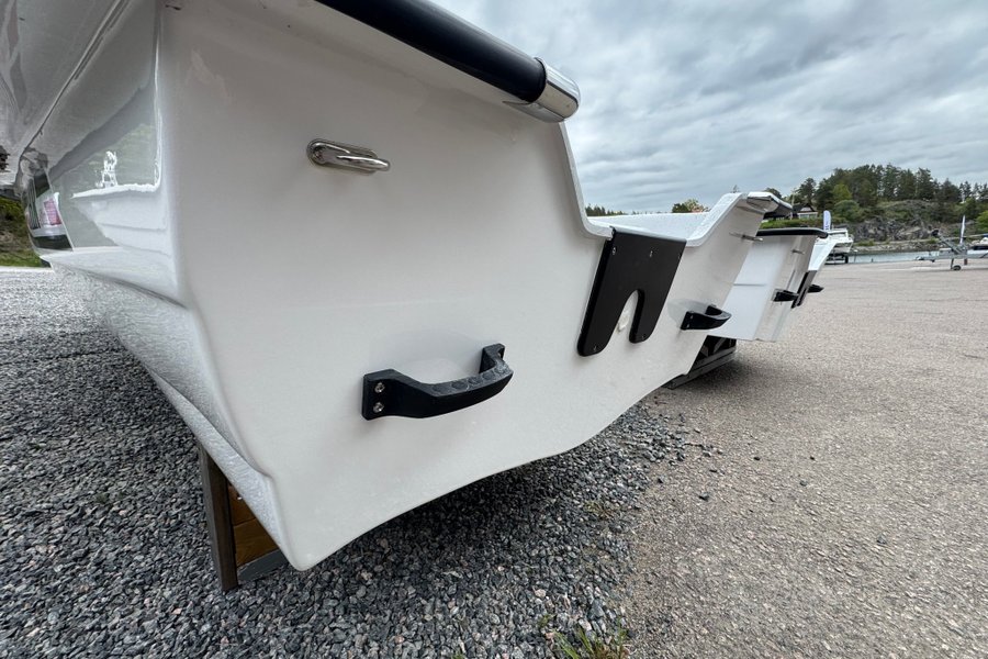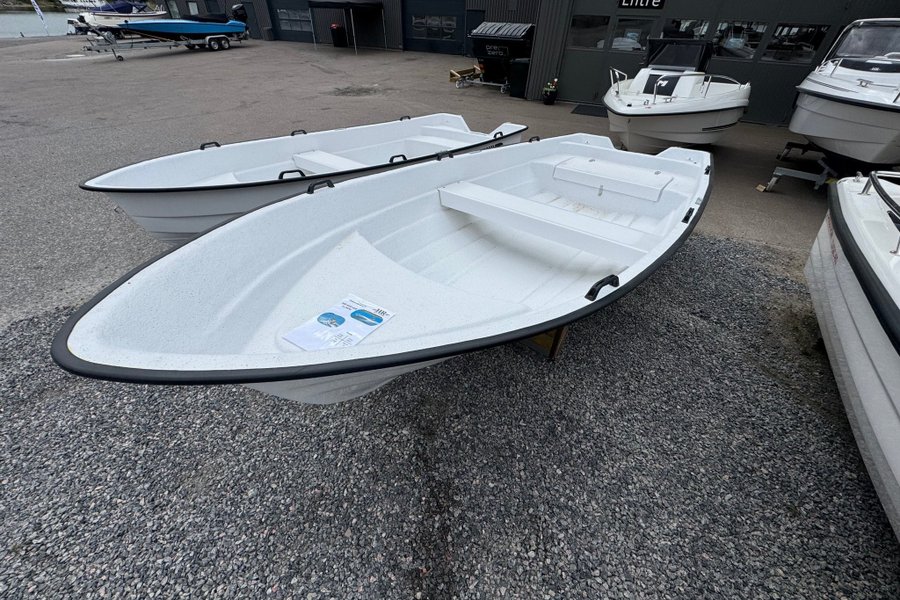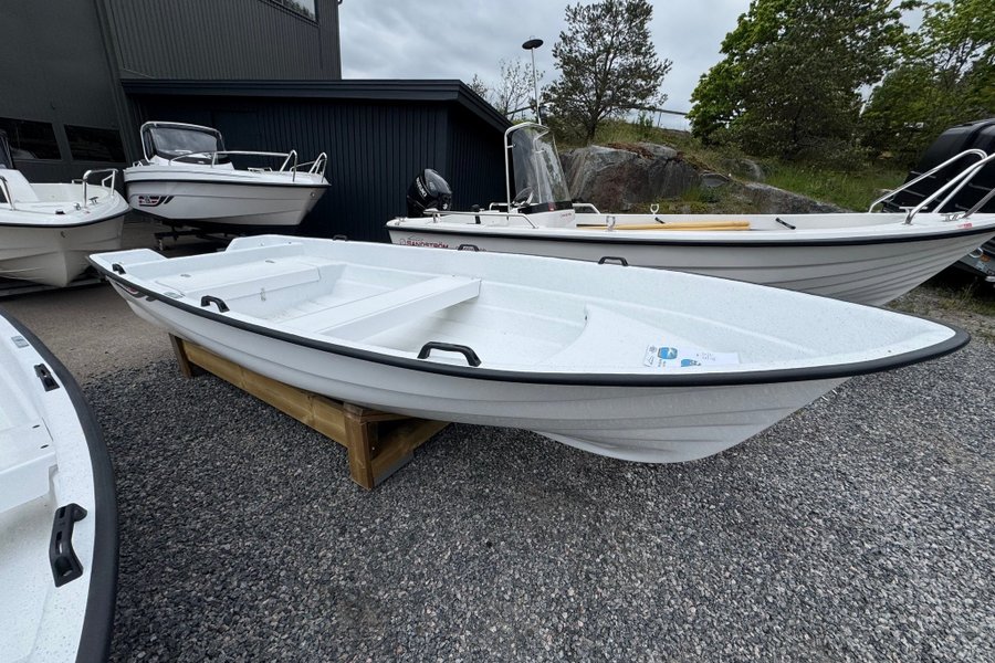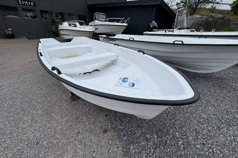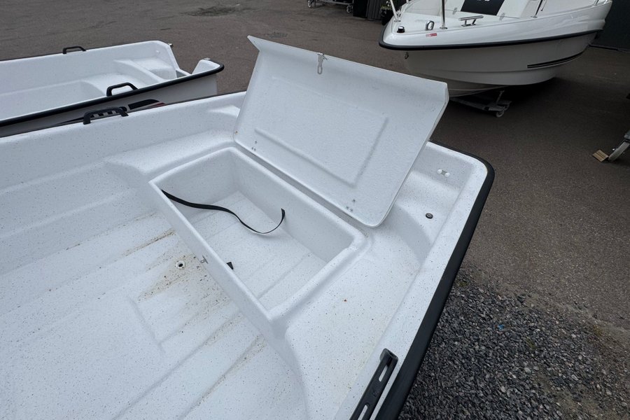 Båten har klinkbyggt skrov och utrustad med låsbart stuvfack med plats för 25-liters tank.