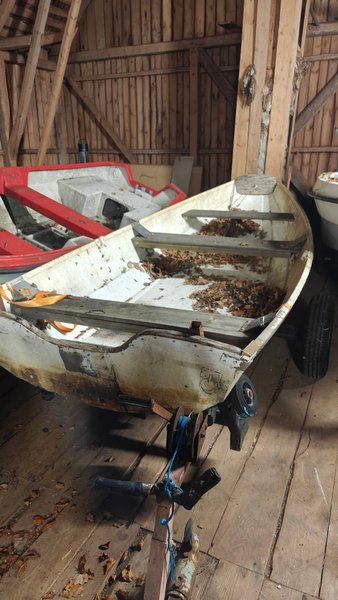Trä eka som är plastad. Synligt trä i för och akter bör bytas ut. Båten är tät utan några hål.