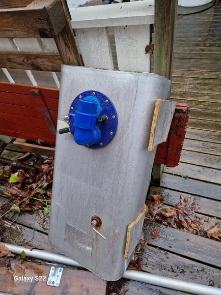Bränsletank rostfri 49 liter, 70*35*24,5 cm. Med anslutningar för bränslesug, bränsleretur, luftning, bränslepåyllning inkl slang o däcksförskruvning, samt även tanksug för dieselvärmare. Kostar ny 4.449 kr exkl tillbehör.