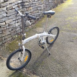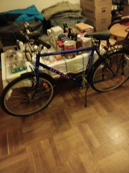 Säljer en cykel. Den har en pakethållare bak och stänkskärmar fram och bak. Cykeln har en stödben.