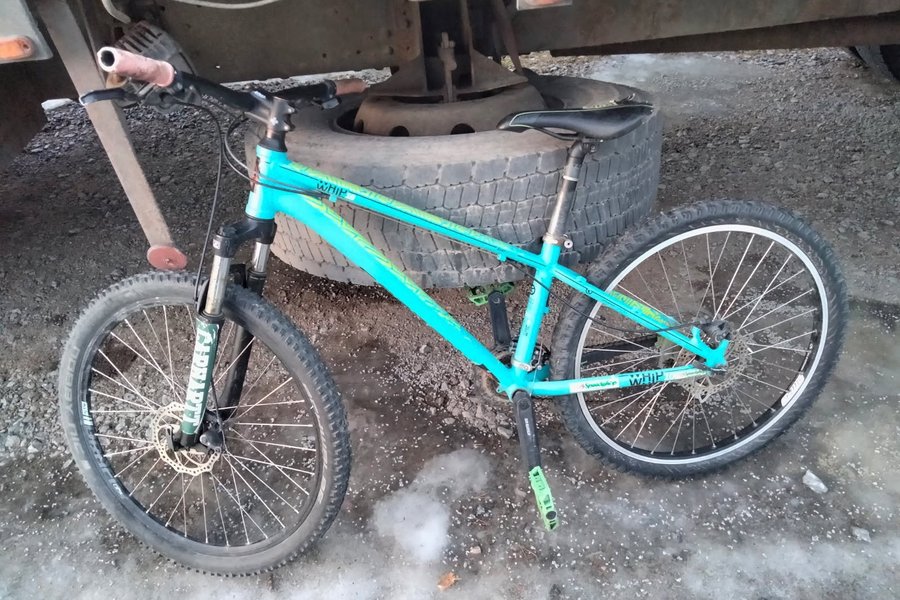 Dirtjump cykel i turkos färg. Cykeln har skivbromsar fram och bak, samt dämpad framgaffel. Sadeln är svart och pedalerna är i en ljusgrön färg.