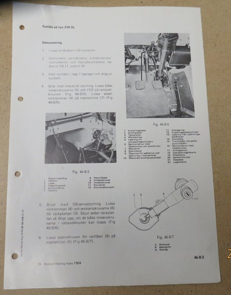 Demonterings instruktioner för rattlås på typ 230 SL. Inkluderar information om demontering av varvräknare, kombinationsinstrument och hastighetsmätare. Anvisningar för bilar med mekanisk styrning och DB-servostyrning.