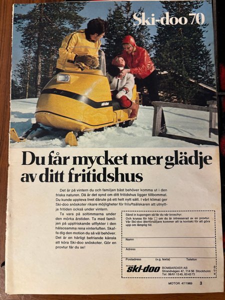 Ett annonsblad för Ski-doo 70. Bombardier AB, Strandvägen Stockholm. MOTOR 47/1969.