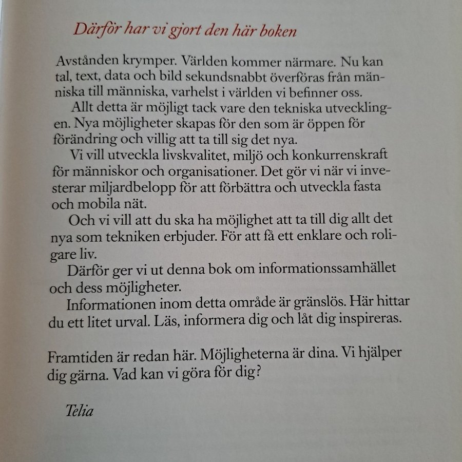 Inspirationsbok om det nya informationssamhället från 1998. Boken utforskar hur datorer, internet och teletjänster kan göra livet enklare och roligare. ISBN 7125-052-2.