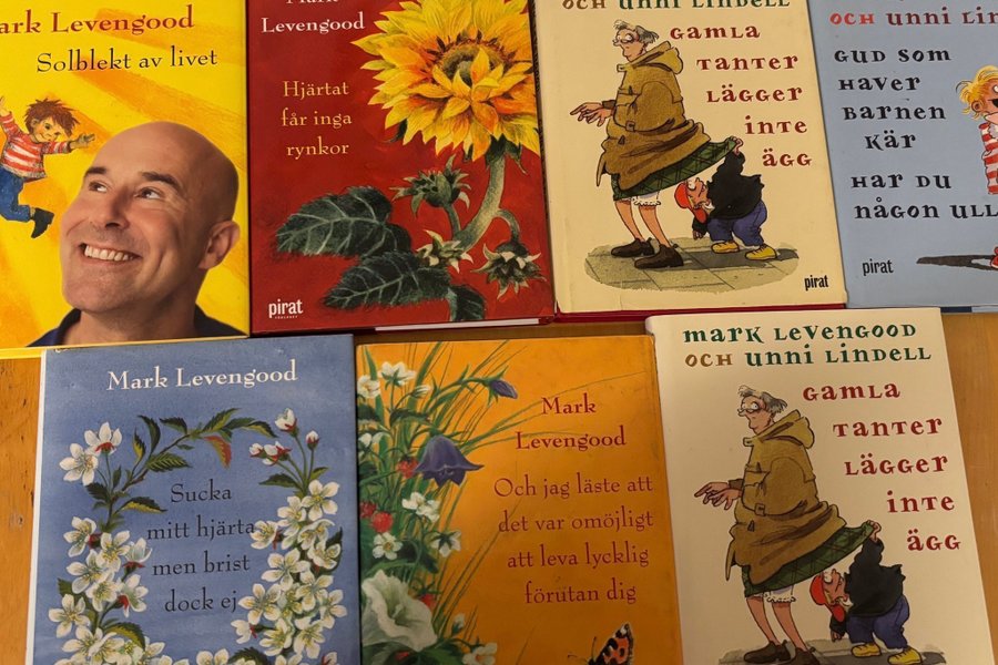 Ett paket med sex böcker av Mark Levengood, inklusive ”Solblekt av livet”, ”Sucka mitt hjärta men brist dock ej”, ”Hjärtat får inga rynkor”, ”Och jag läste att det var omöjligt att leva lycklig förutan dig”, ”Gamla tanter lägger inte ägg” x 2 och ”Gud som haver barnen kär”. Vissa mer slitna andra nästan nyskick.