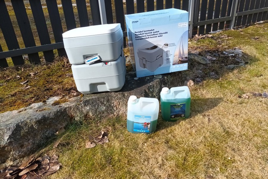 Kemtoalett från Biltema med 1,5 dunkar saneringsmedel, använd en vecka under renovering av badrum. Ny pris för allt 1100 kr