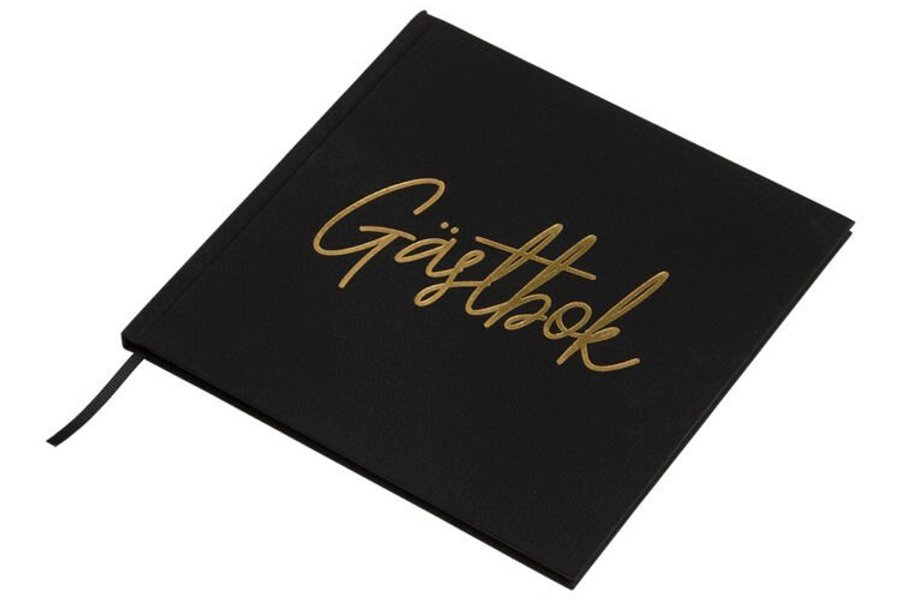 Svart gästbok med texten "Gästbok" i guldfärg på framsidan.
