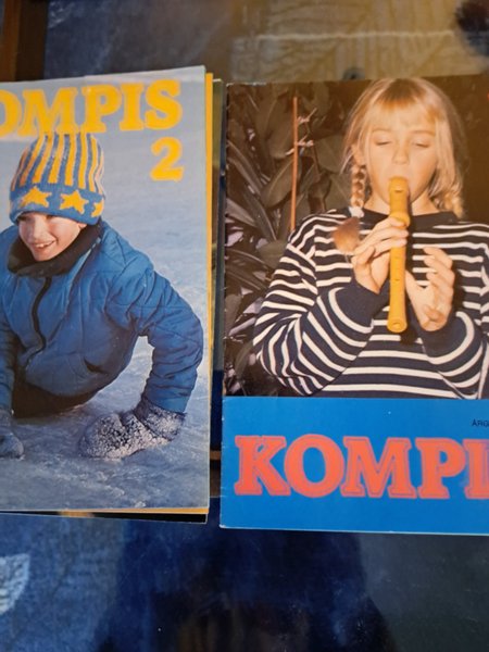 Två tidningar med titeln "Kompis". Den ena visar ett barn i en blå jacka och randig mössa som leker i snön. Den andra visar en flicka med flätor som spelar flöjt.