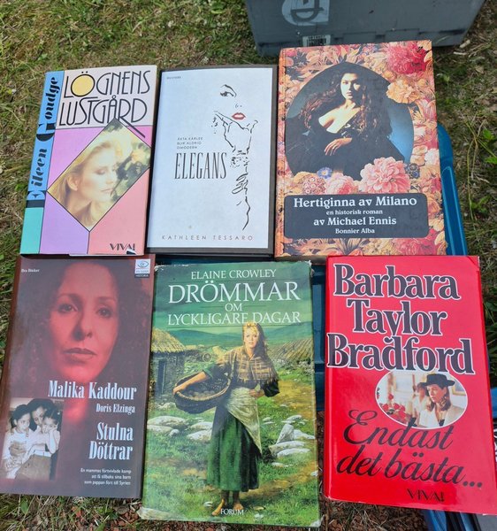 Bokpaket med 6 böcker. Innehåller titlarna: Lögnens Lustgård av Eileen Goudge, Elegans av Kathleen Tessaro, Hertiginna av Milano av Michael Ennis, Stulna Döttrar av Malika Kaddour & Doris Elzinga, Drömmar om lyckligare dagar av Elaine Crowley, Endast det bästa... av Barbara Taylor Bradford.