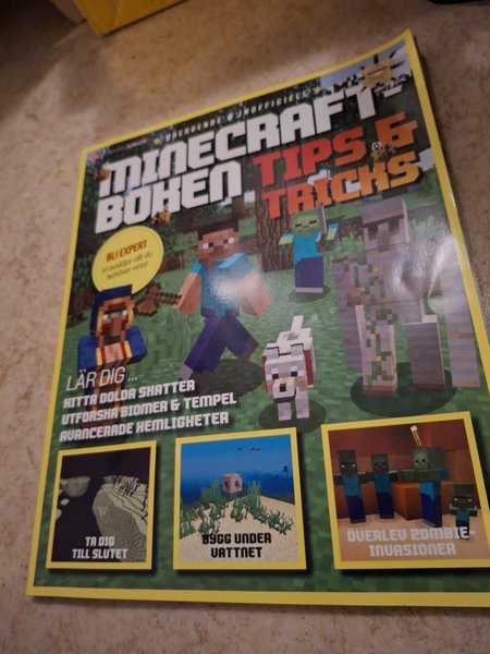 Tidningen "Minecraft Boken Tips & Tricks" innehåller guider för att hitta dolda skatter, utforska biomer och tempel, avancerade hemligheter, hur man tar sig till slutet, bygger under vattnet och överlever zombieinvasioner.