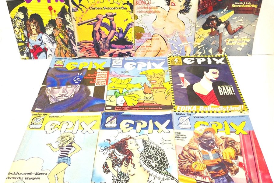 Ett parti med 10 Epix-tidningar. Innehåller olika serier och berättelser. Perfekt för samlare eller den som vill läsa vuxenserier.