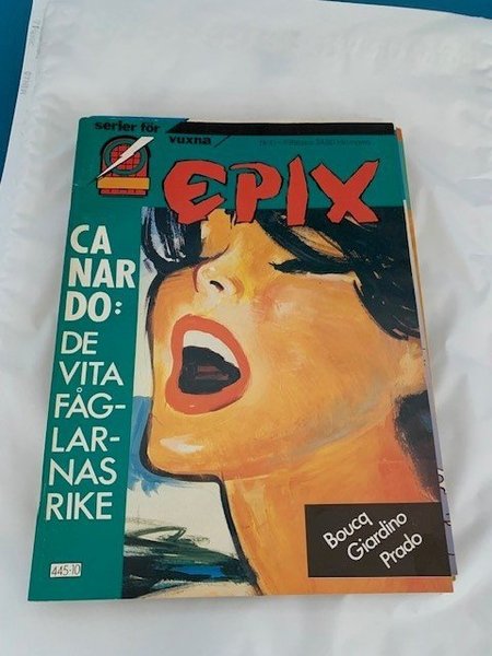Oläst men inte NM. Epix: Canardo: De Vita Fåglarnas Rike är en serietidning för vuxna. Denna utgåva innehåller verk av Boucq, Giardino och Prado.