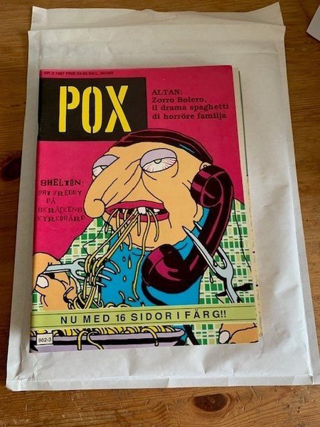 oläst men inte i nyskick. Tidningen POX från 1987, nummer 3. Innehåller serierna "Zorro Bolero, il drama spaghetti di horröre familja" av Altan och "Bat Freddy på skräckens kyrkogård" av Shelton. Tidningen har 16 sidor i färg.