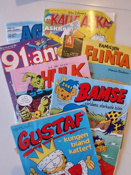 Flinta 1966:7, Hulk 1983:6, Agust o Lotta 1990, 91:an 1992:25, Bamse 2001:4, Kalle Anka 2004:37. Bonus: Gustaf 2001:11 (något sämre skick).