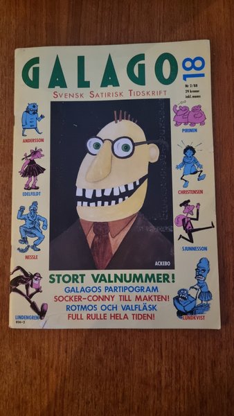 Svensk satirisk tidskrift, nummer 2/88. Innehåller "Stort valnummer! Galagos partiprogram, Socker-Conny till makten! Rotmos och valfläsk, Full rulle hela tiden!". ISBN 826-2.
